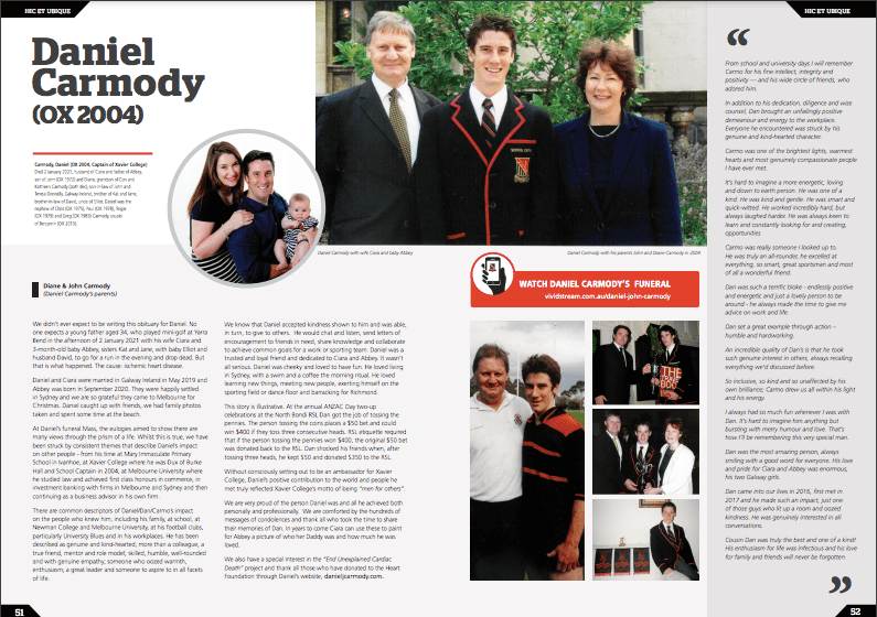 Click here to access the obituary written by Daniel’s parents, John and Diane Carmody, which was published in the most recent Xavier College News (Edition 1 2021).